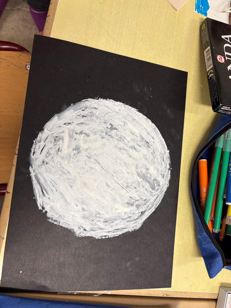 Met pastelkrijt en een sjabloon ontwierpen ze hun eigen planeet.